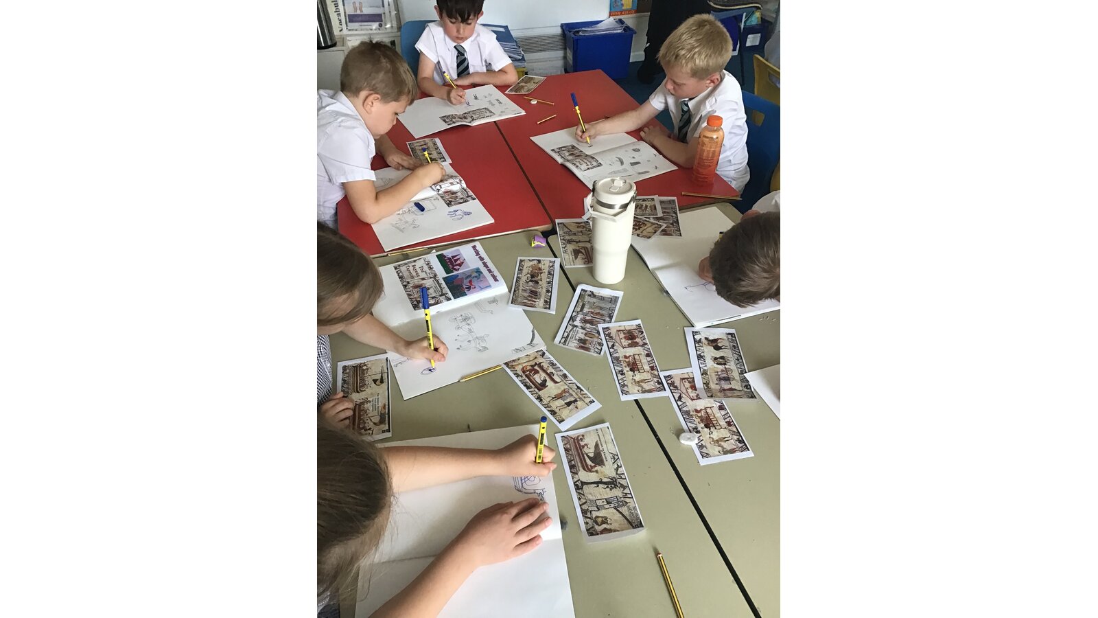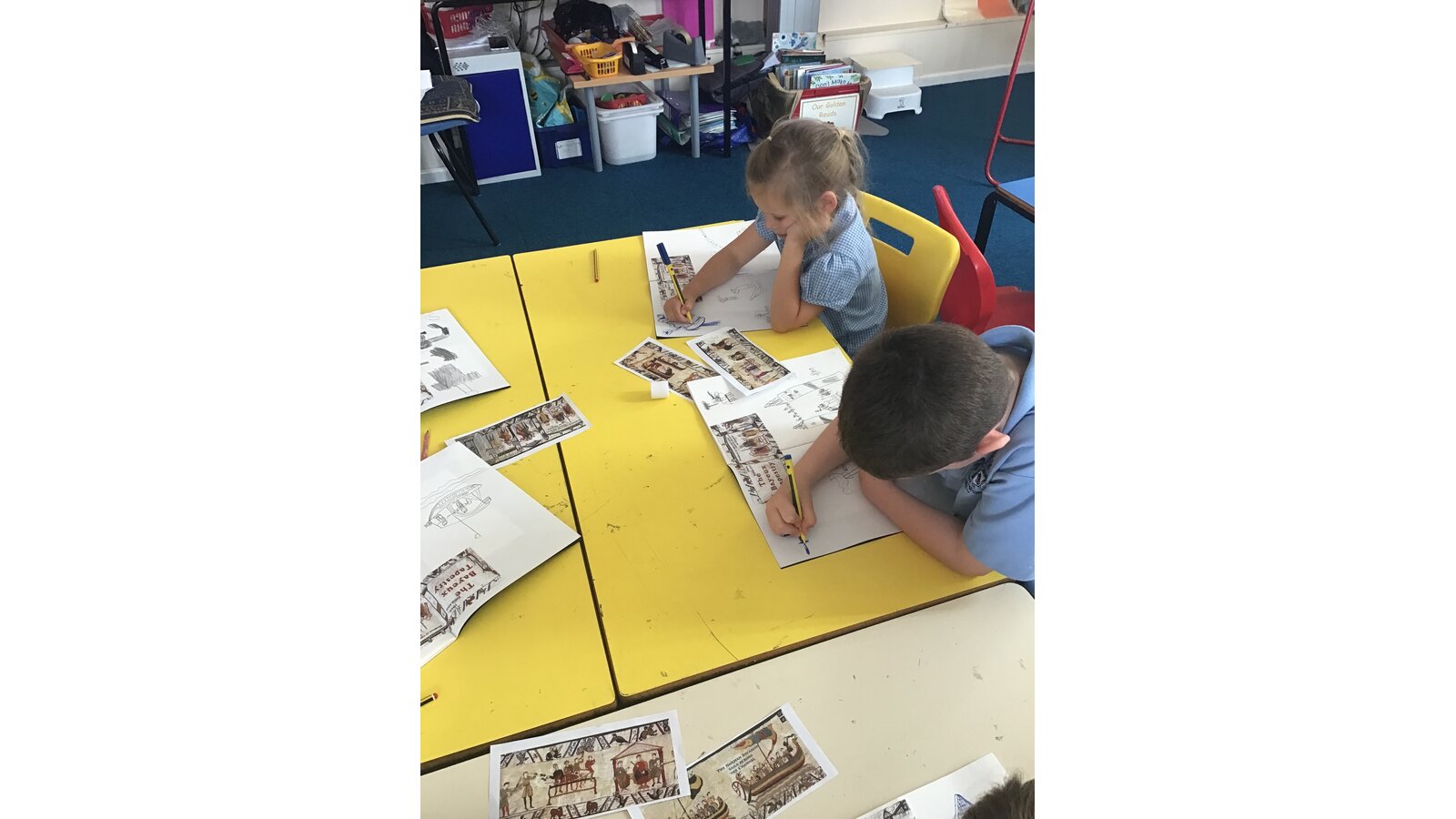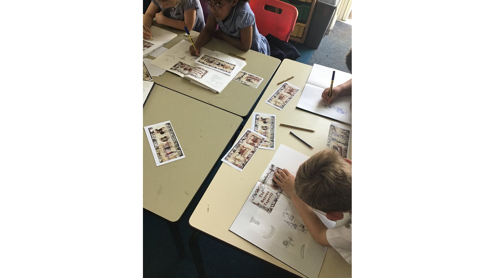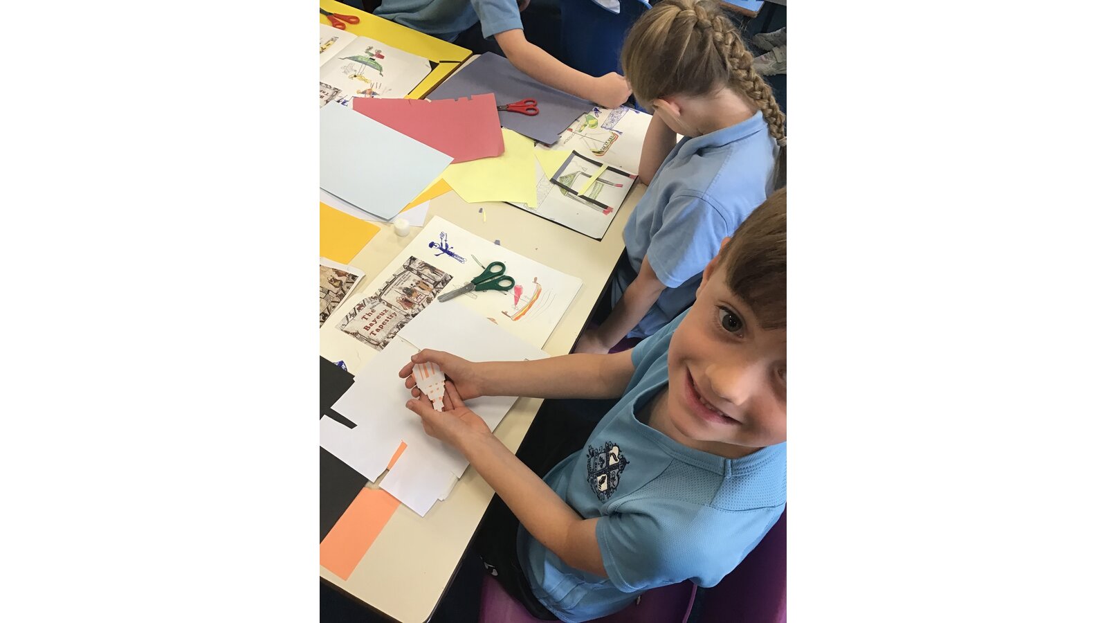 Class 2 have had a great time during art week! We have looked closely at the Bayeux Tapestry taking note of different patterns, colour, lines and shapes. We then looked at the artist Henri Matisse and his ‘cut-outs’ period. This inspired us to create our own cut out artwork based on the Bayeux Tapestry.