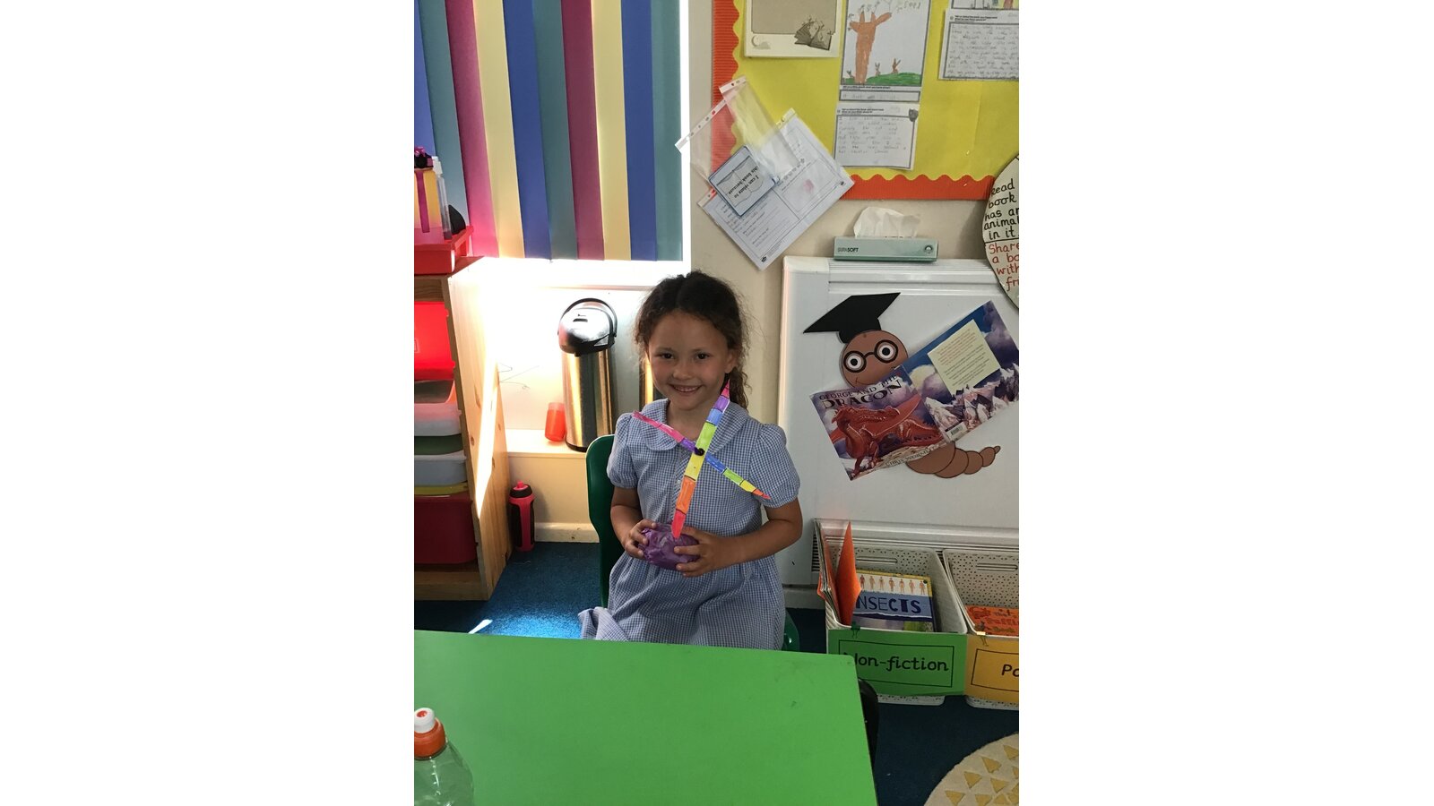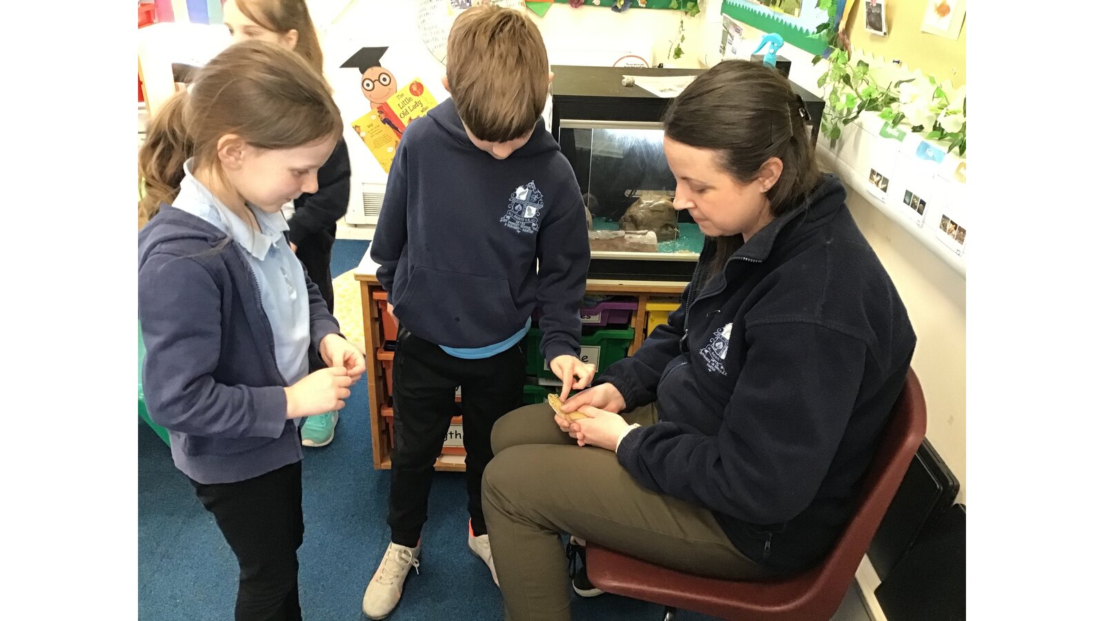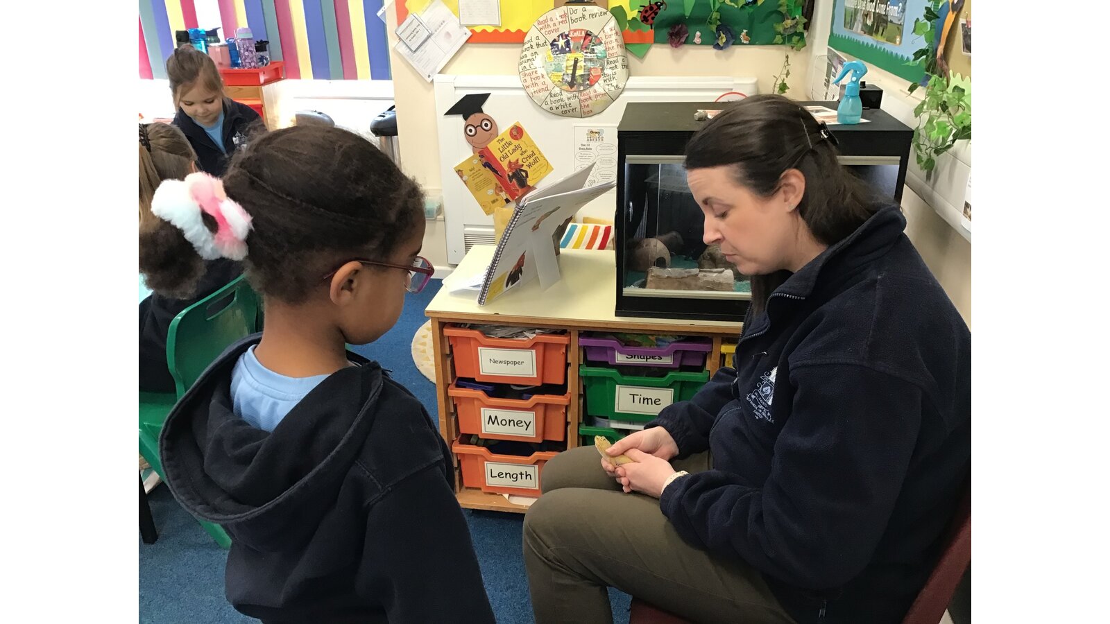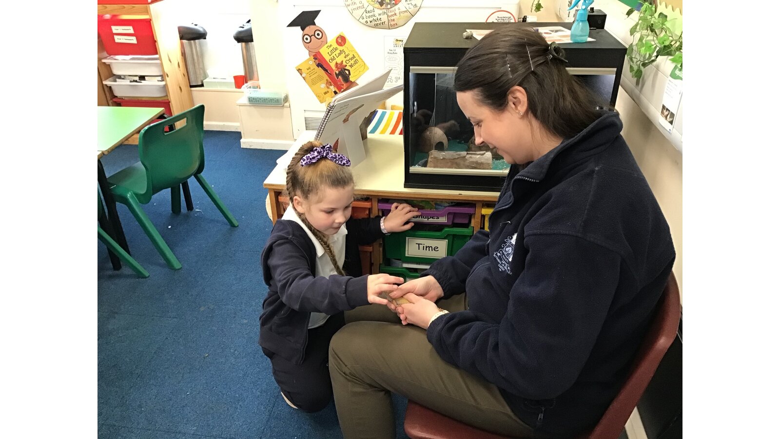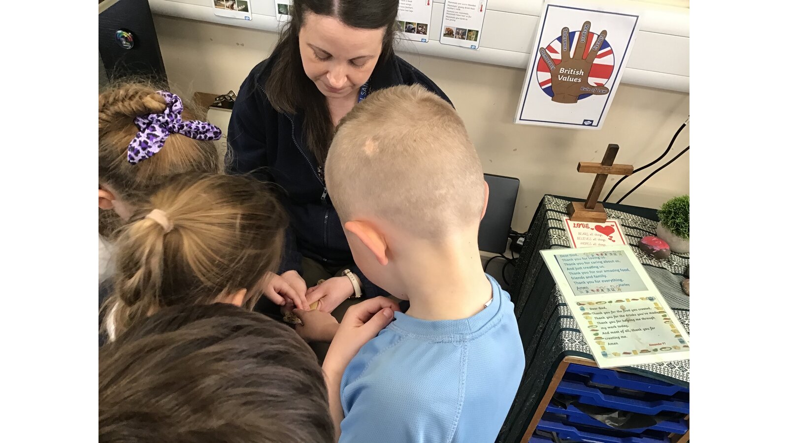 Last week our class pet, Curly the leopard gecko, came out to say hello just before we went home. It's not very often he's awake in the daytime so we took the opportunity to allow all the children to say hello and stroke him if they wanted to. Curly is a wriggler at times, but the children are all very gentle with him and enjoy seeing him out and about. We learn a lot about his lifestyle including what he eats and how often he sheds his skin. Some of us are even lucky enough to watch him hunt and catch a cricket or a locust. We also give him waxworms as a treat.